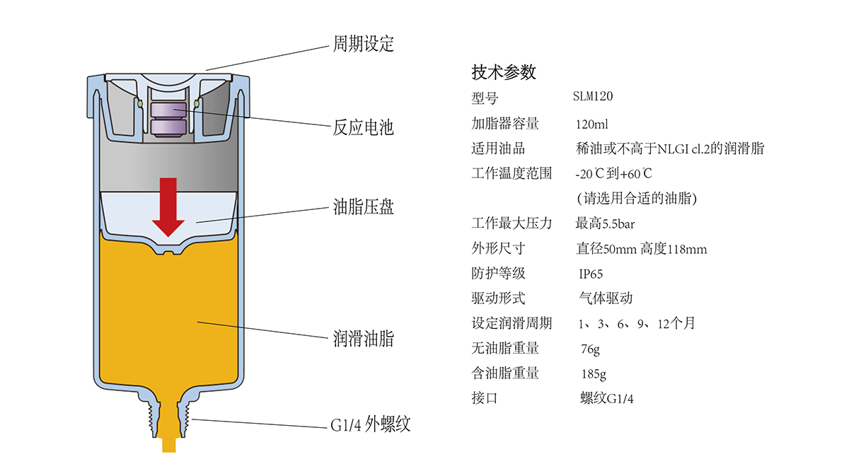 1GLAN艾迪朗SLM系列自動注油器不含泵、電池、電機等 零件,使用時無需電源或壓縮空氣,一旦安裝并激活啟用, 就能在您設(shè)定的使用周期內(nèi)自動工作,每一個自動注油器 頂部都含有其獨一無二的電化學(xué)驅(qū)動機構(gòu),不含彈簧或其 他機械零件,調(diào)整時間撥盤,芯片接觸后發(fā)生電化反應(yīng)注 油器便激活,由此產(chǎn)生的穩(wěn)定而不斷增長的氣體壓力推動 活塞,慢慢擠壓出油脂。加脂器激活后,電池反應(yīng)產(chǎn)生的 氣體被絕對密封在注油器的頂部機構(gòu),不會對注油器中的油脂產(chǎn)生污染,更不會污染周圍環(huán)境。自動注油器在工作時,透明的觀察窗口能清楚顯示油脂釋放量。