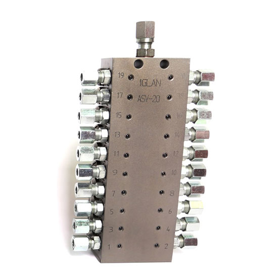 ASV型整體式分配器有6、8、10、12、14、16、18、20、22出油口,標準單出口流量為0.2 ml/cyc,可拆除堵頭賀鋼珠及更換出油堵塞,提供0.4ml/cyc、0.6ml/cyc等為0.2 micca整倍數(shù)的排量。柱塞套通過油孔相連,以便建立壓力,只要有壓力的潤滑油進入進油口,分配器就會以遞進式的方式連續(xù)工作。一旦其中一個通道潤滑油停止流動,分配器中整個柱塞也將停止工作。因此,通過安裝特定的可目測機械式傳感器,觀察整個分配器的運動狀況,一旦發(fā)生堵塞,可有報警信號輸出,以便對整個潤滑系統(tǒng)進行監(jiān)控。